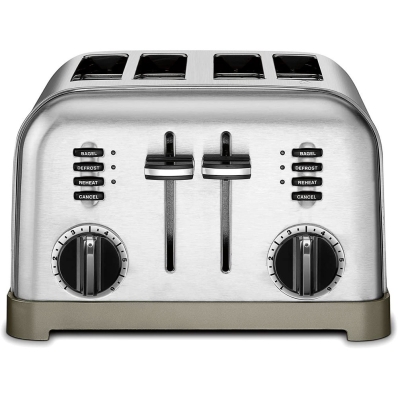 Torradeira Cuisinart Metal Classic. Torradeira Metal Classic da Cuisinart tem uma caixa de aço inoxidável escovado lisa com cromo polido e detalhes em preto. Seus controles personalizados permitem descongelar e torrar bagels e pão - do jeito que você quiser Pressione qualquer um dos quatro botões, bagels, reaquecer, descongelar e cancelar, para atender às suas necessidades de torrar. O controle de escurecimento define a cor de torrada desejada de claro a escuro, com seis níveis de escurecimento. |