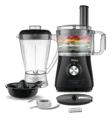 * O Multiprocessador Philco All In One Citrus 800W é um aparelho 3 em 1: espremedor de frutas, liquidificador e processador, ideal para preparar uma variedade de receitas, pois processa, corta, mistura, fatia, rala, pica e liquidifica; * Possui duas velocidades mais função pulsar, atendendo a todas as necessidades culinárias; * A jarra do processador tem capacidade de 1,2L e o copo do liquidificador comporta 2,2L, permitindo a preparação de receitas em quantidade adequada; * O sistema microstore permite que todos os acessórios sejam guardados dentro da jarra, facilitando a organização, com exceção do espremedor; * Desenvolvido com material que pode ser limpo em lava-louças, proporcionando facilidade na limpeza; * Apresenta design vertical que economiza espaço na cozinha; * Inclui pés antiderrapantes e trava de segurança, garantindo o uso seguro do aparelho, que só funciona quando montado corretamente. Aviso legal * Livre de BPA. |