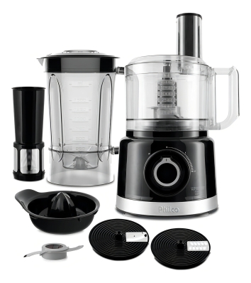 | Acessórios incluídos | 1 disco ralador, 1 disco fatiador, 1 empurrador duplo, 1 espremedor, 1 copo liquidificador |