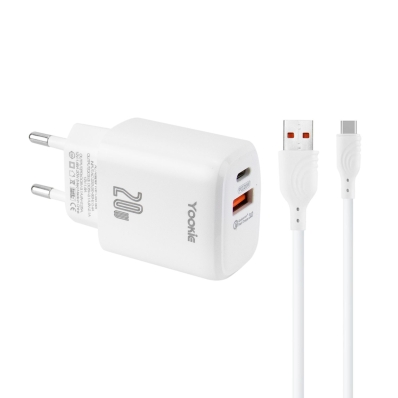 Carregador Yookie EI3Y - 20W - USB/Tipo C - Cabo Tipo C - Bivolt - Branco